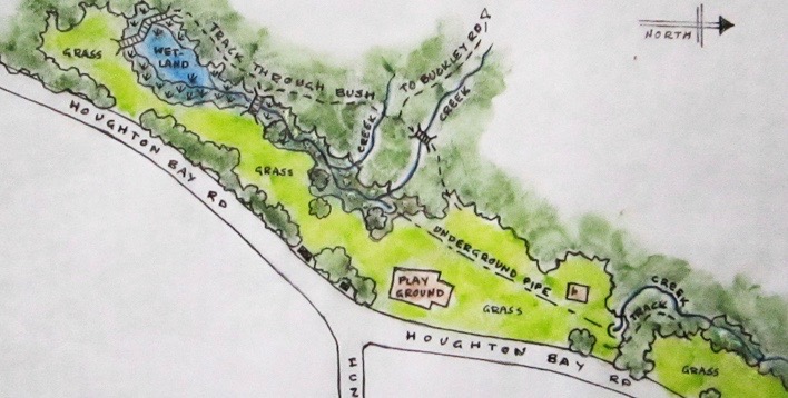 Cleaning up HoughtonBay and Lifting the Creek: Three further contributions have been received, and Jenny from Houghton Bay Rd has created an interesting map to show her ideas about the creek and the wetland. She hopes this inspires others to draw their ideas for the next newsletter.