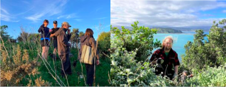 More recently, Te Ohu o Te Raekaihau kicked their weeding season off tackling Helichrysum petiolare or Licorice plant, a weed from South Africa. Fortunately there is only one (known) infestation of the plant in the reserve so eradicating it from the headland means that they can focus on other priorities: Evergreen Buckthorn, Old Man’s Beard, tradescantia, Cape Ivy, Japanese Honeysuckle and English Ivy. Another beautiful day.