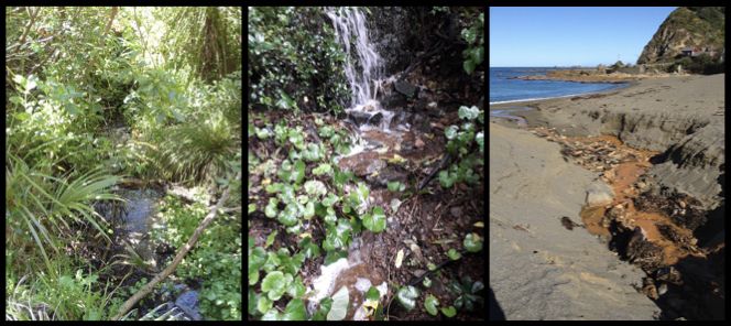 This project is about restoring Te Mauri o te Wai, the health of the water that graces our valley with its presence: whether it be our freshwater springs and our creek buried under the landfill; the rainwater that rushes down the hills, off houses and along gutters during heavy rain; or the sea in Houghton Bay that is part of the Tapu Te Ranga marine reserve. Much of the water that lands in our catchment is directed into pipes beneath our old landfill, becoming contaminated with leachate. This water is generally directed to the sewer, but in heavy rain (and many other inexplicable times) this sometimes highly polluted water ends up in the sea.